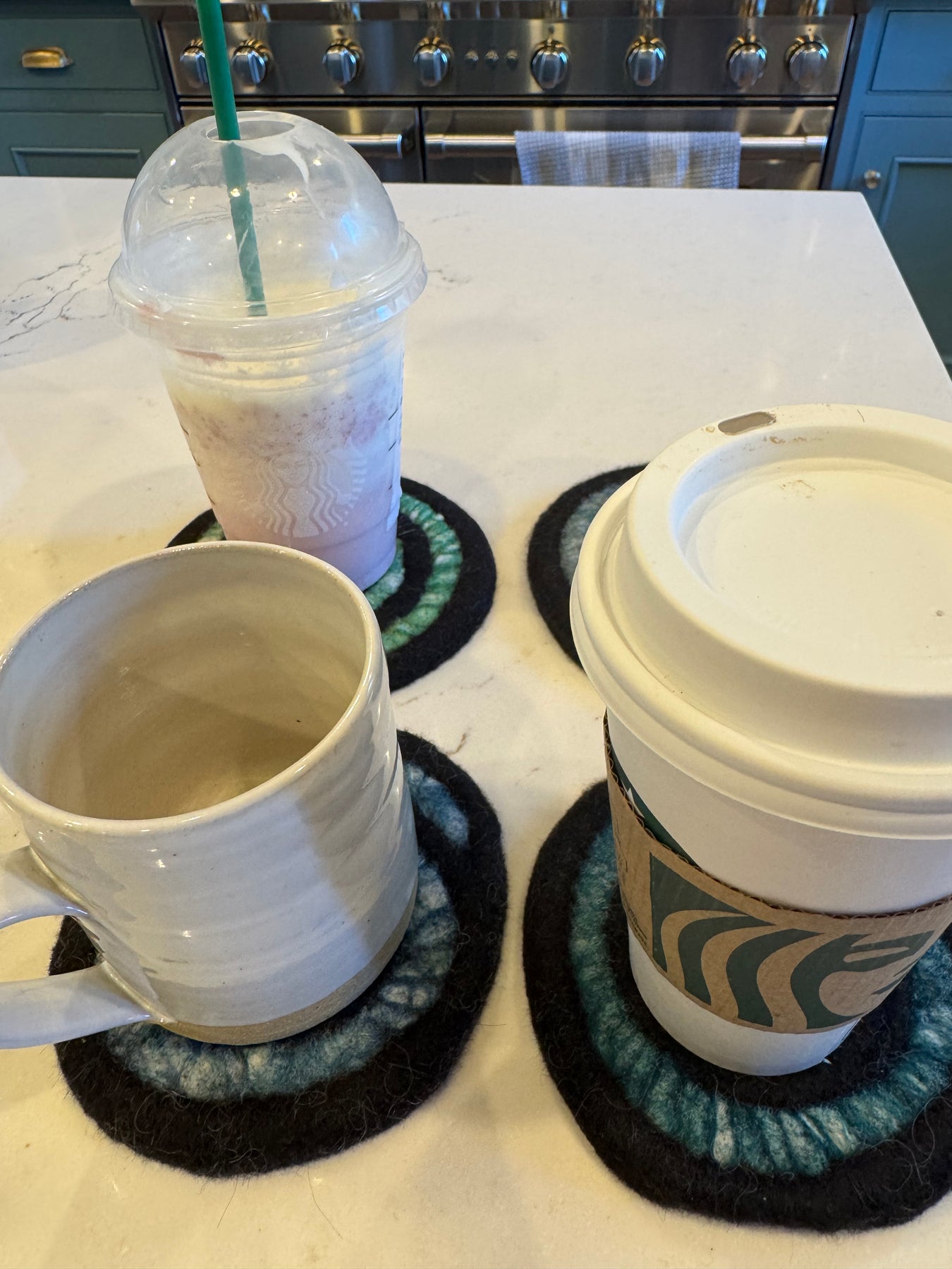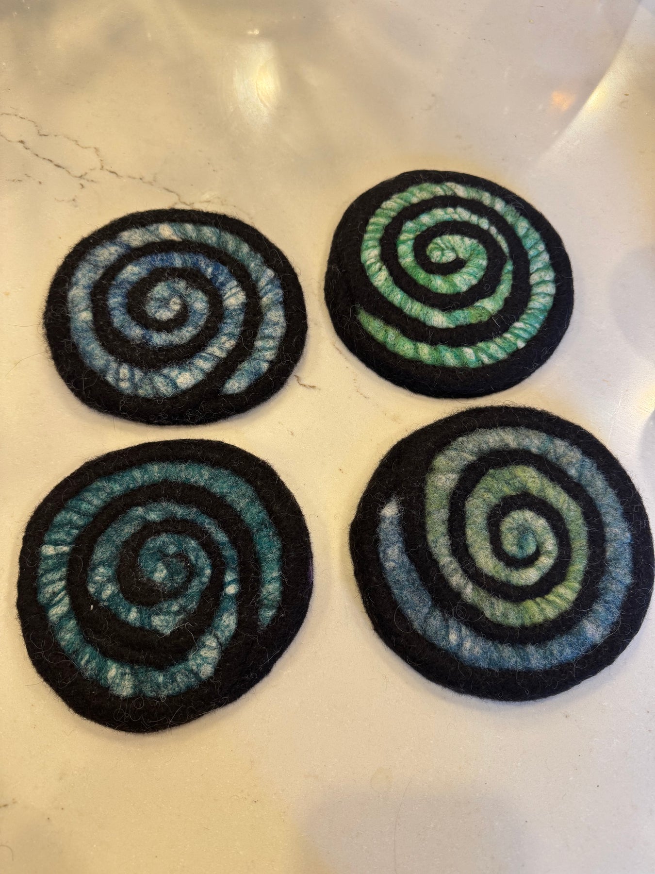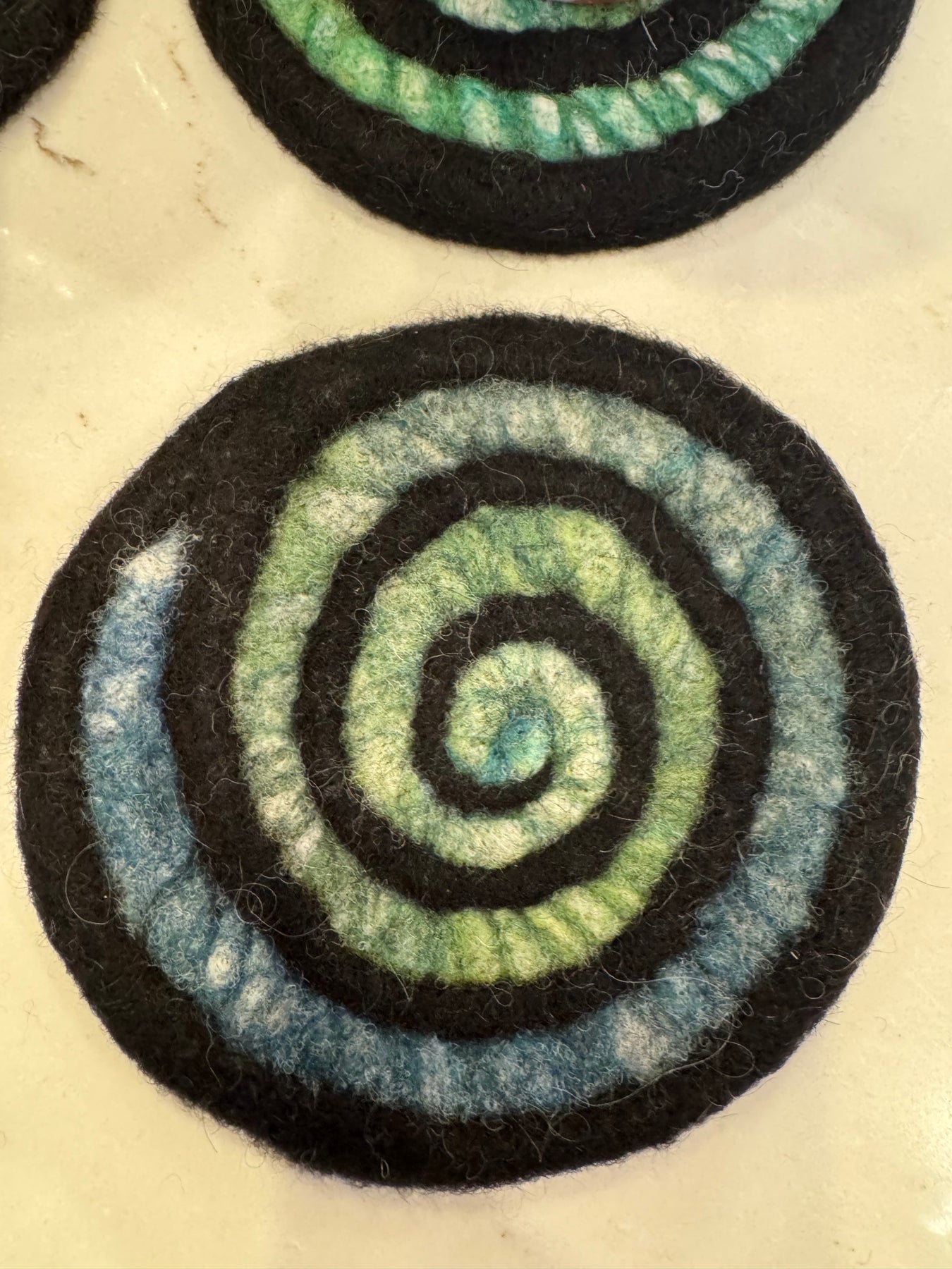 Coaster made from felted alpaca fiber! They are handmade with fiber from our Alpacas sheared here at Enchanted Farms!!! Approximately 5.5” diameter. They are felted with a felt backing with an alpaca decoration. Each one is one of a kind!!