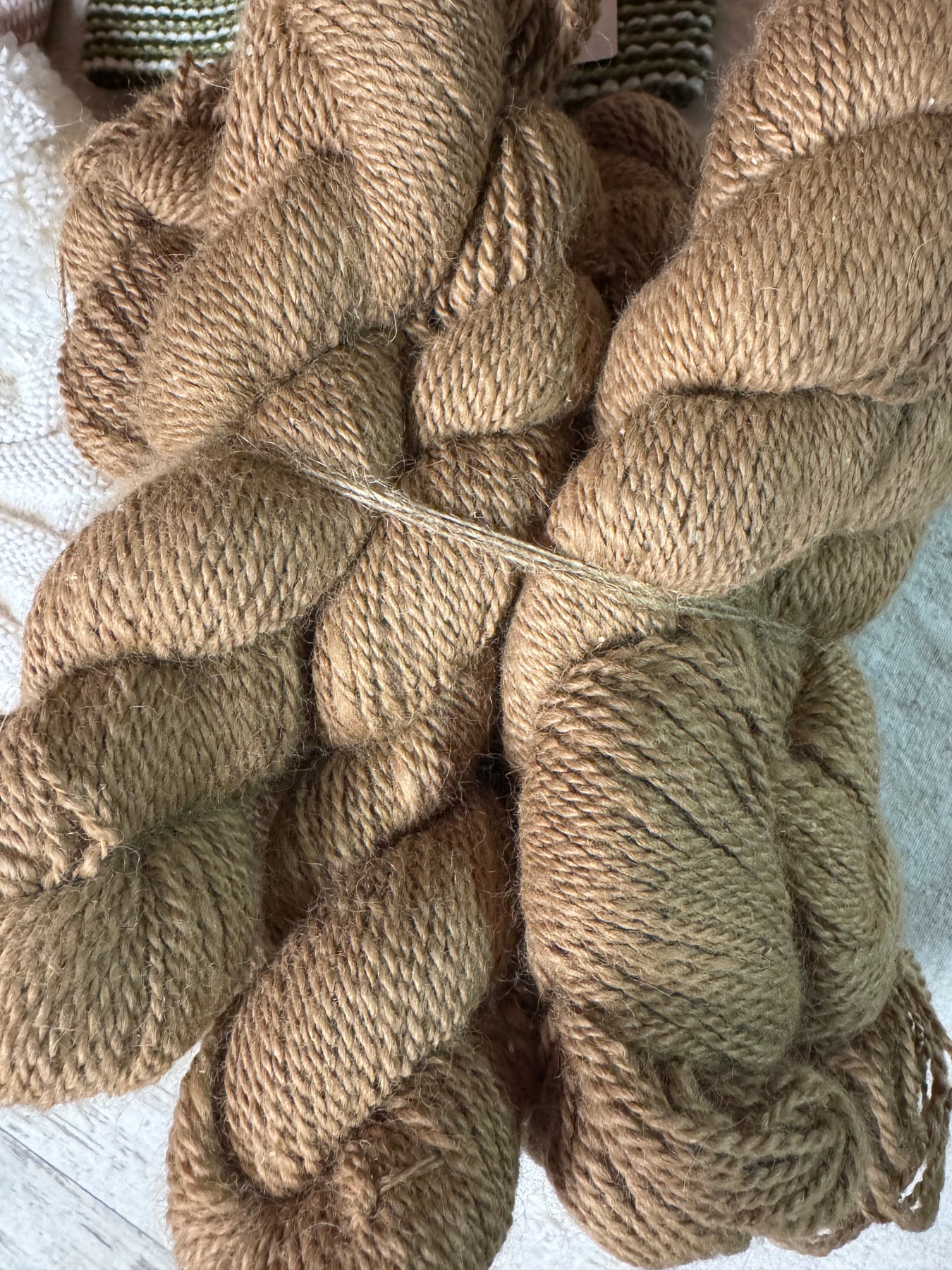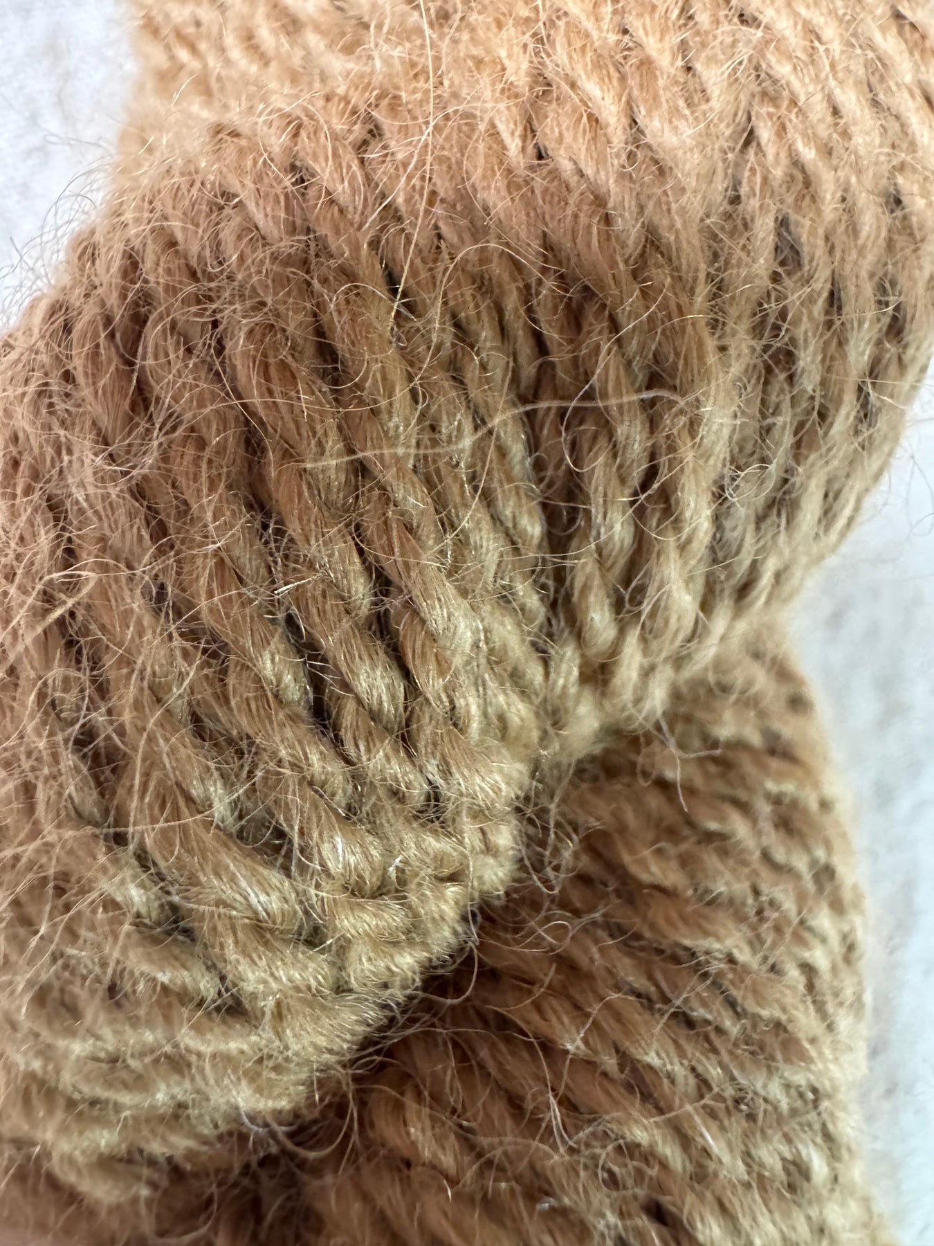 Butterly soft yarn skein from our sweet girl, Tiffany. Yarn is ethically sourced (from yearly shearing). 100% Alpaca yarn. Fawn 2-ply sport wt 150yds. Yarn is natural and undyed.