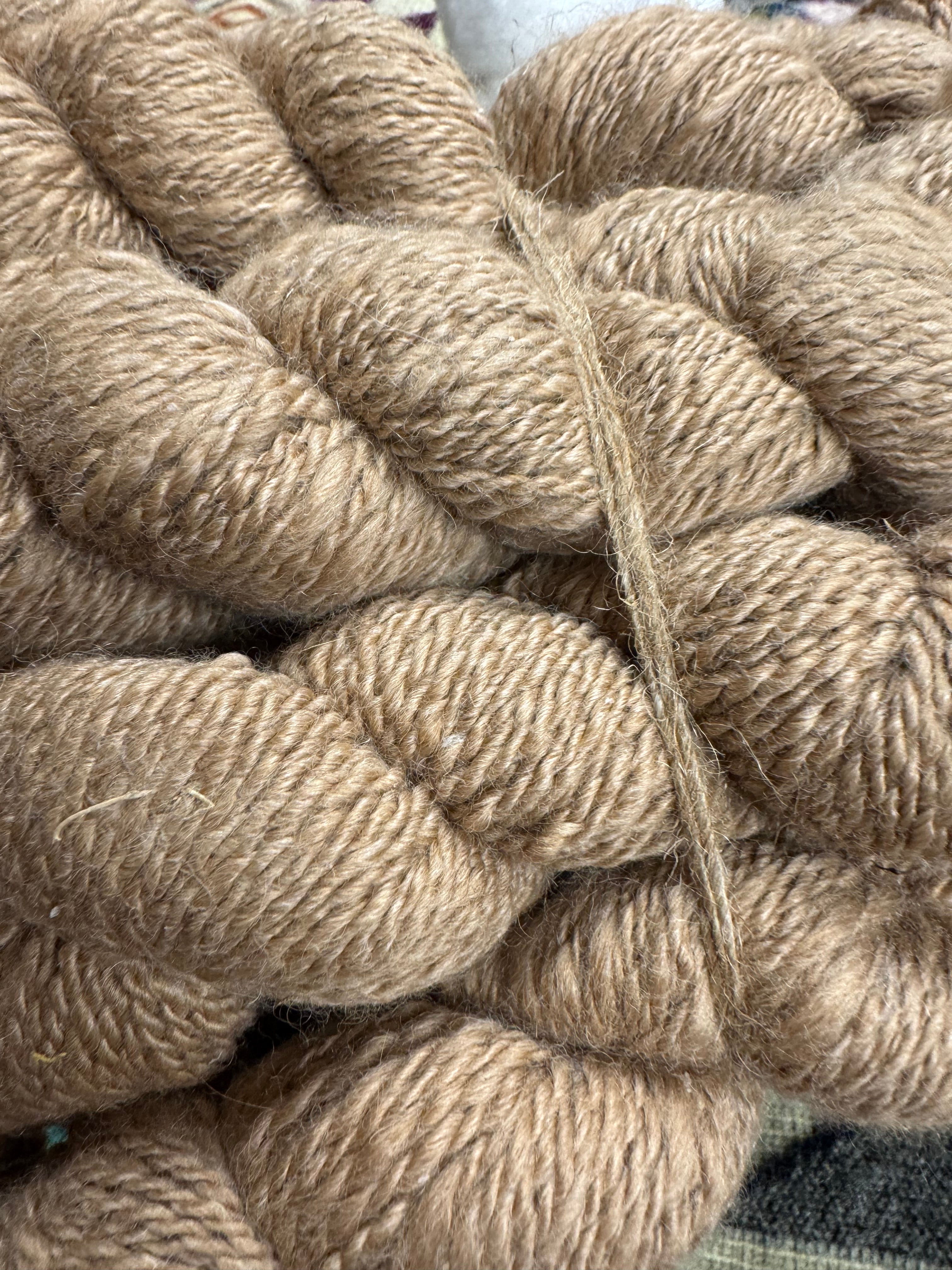 Buttery soft yarn skein from our sweet boy, Charleston. Yarn is ethically sourced (from yearly shearing). 100% Alpaca yarn. Fawn 2-ply worsted. 90 yds. Yarn is natural and undyed.