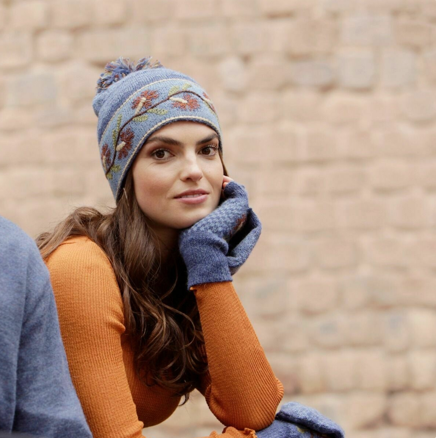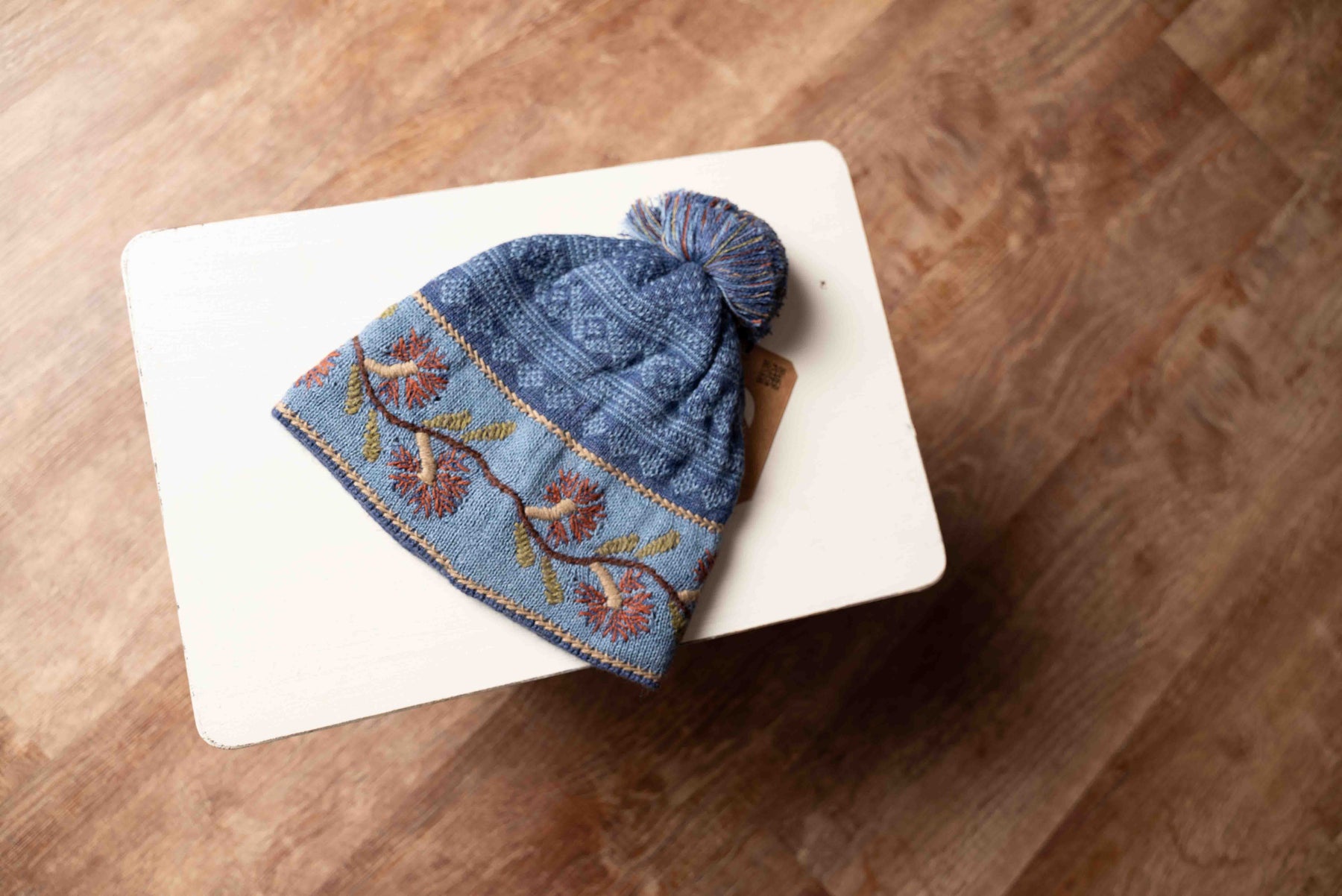 Natural-toned embroidery against a background of muted blues makes our fleece-lined Amber Forest Cap with coordinating yarn pom-pom ideal for a fall hike.