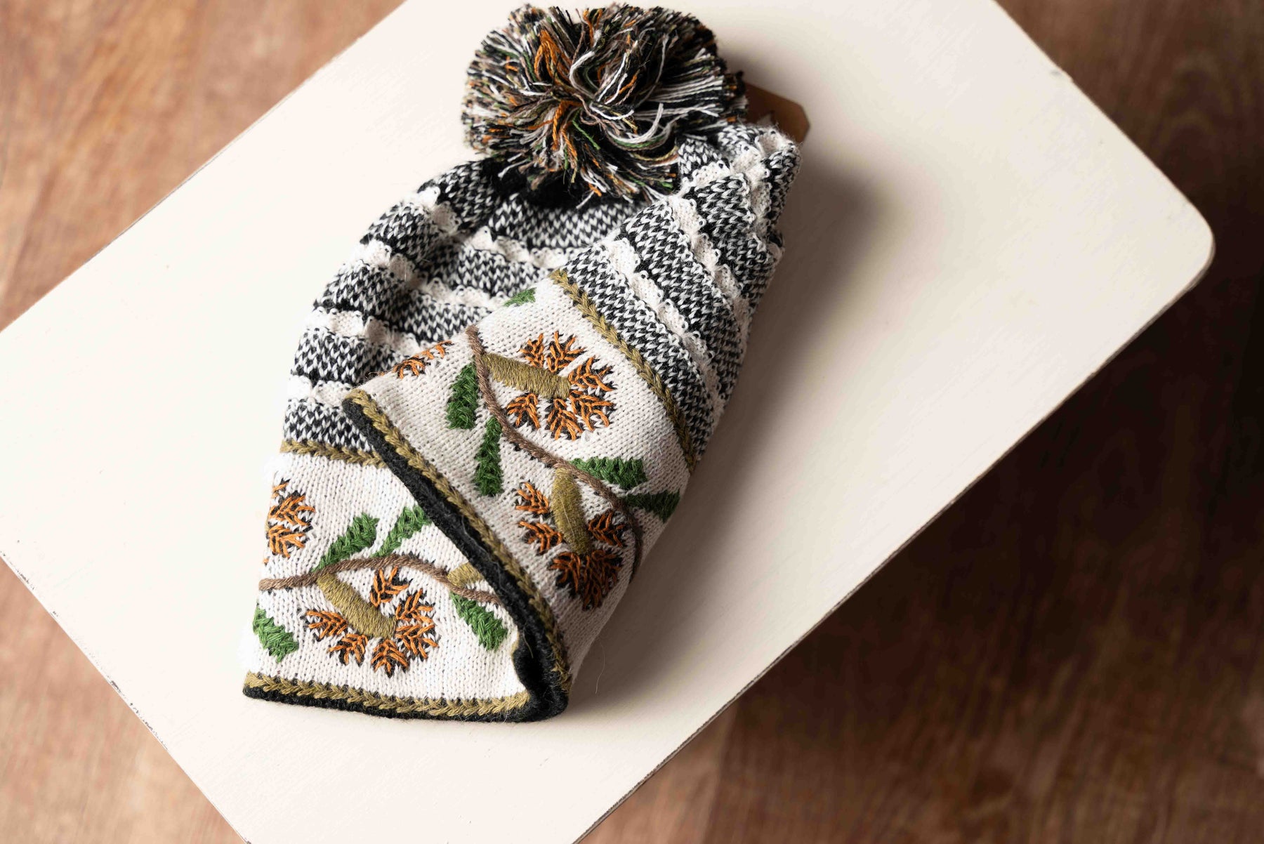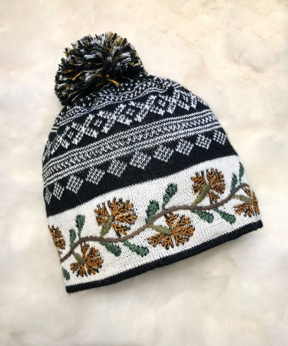 Natural-toned embroidery against a background of contrasting black and ivory makes our fleece-lined Forest Glen Cap with coordinating yarn pom-pom ideal for a winter hike.