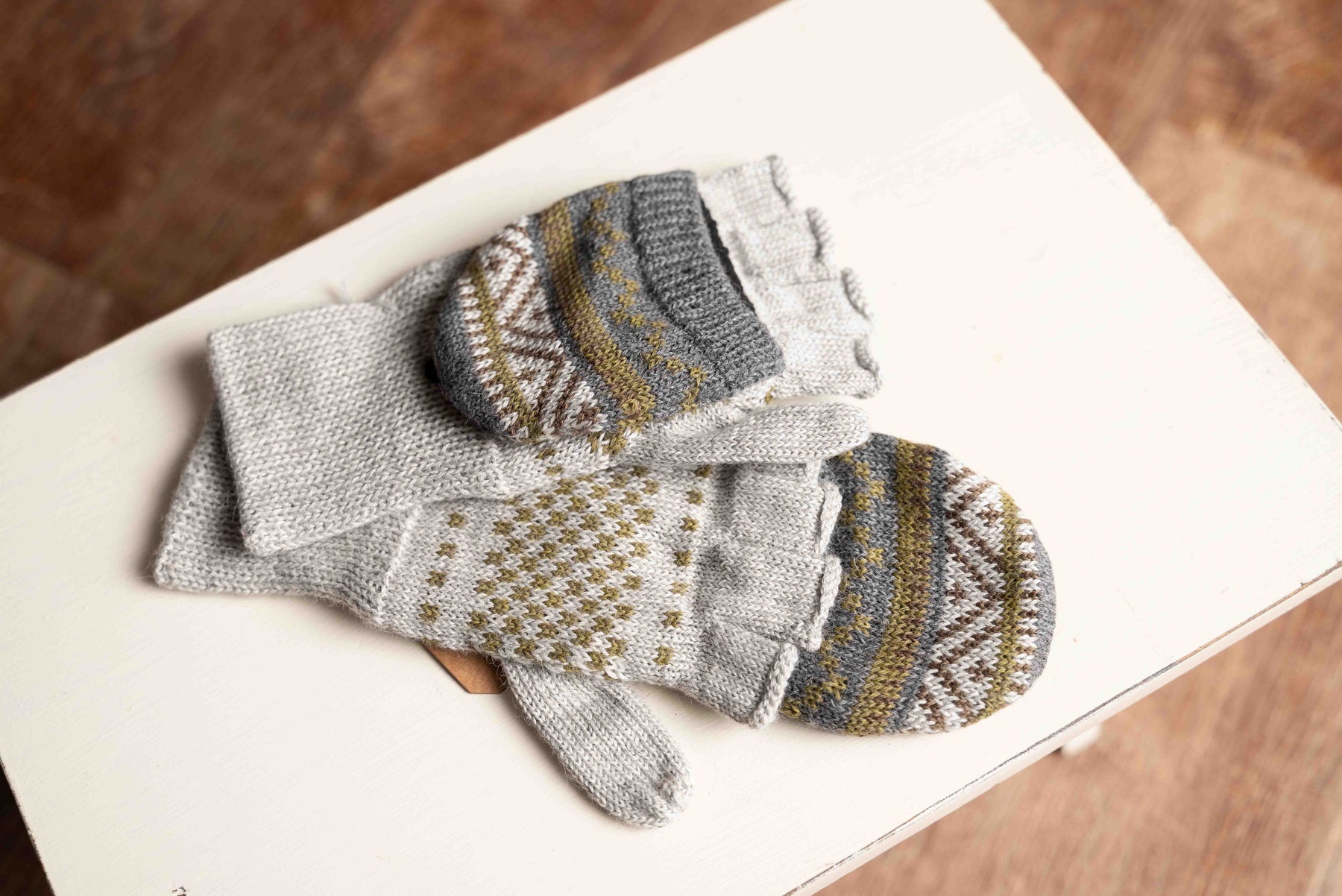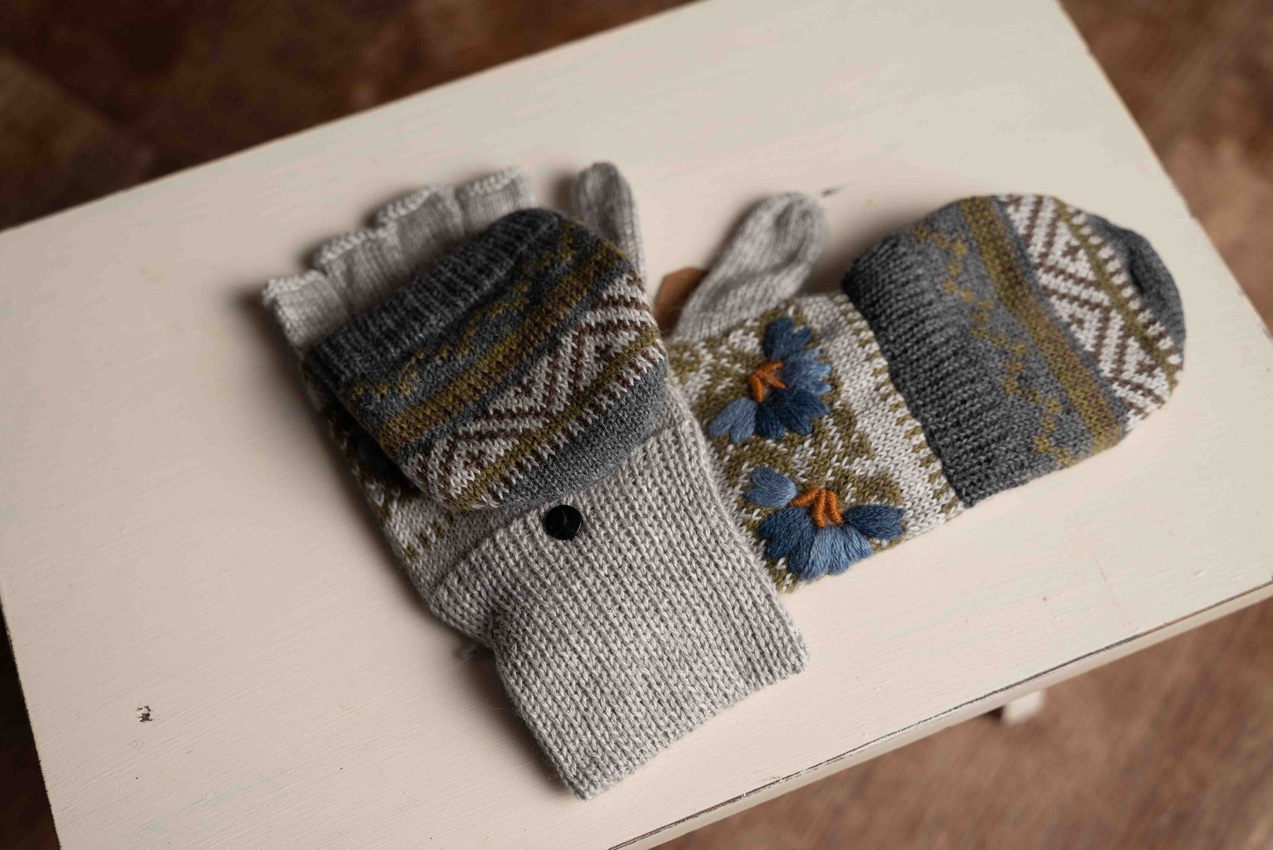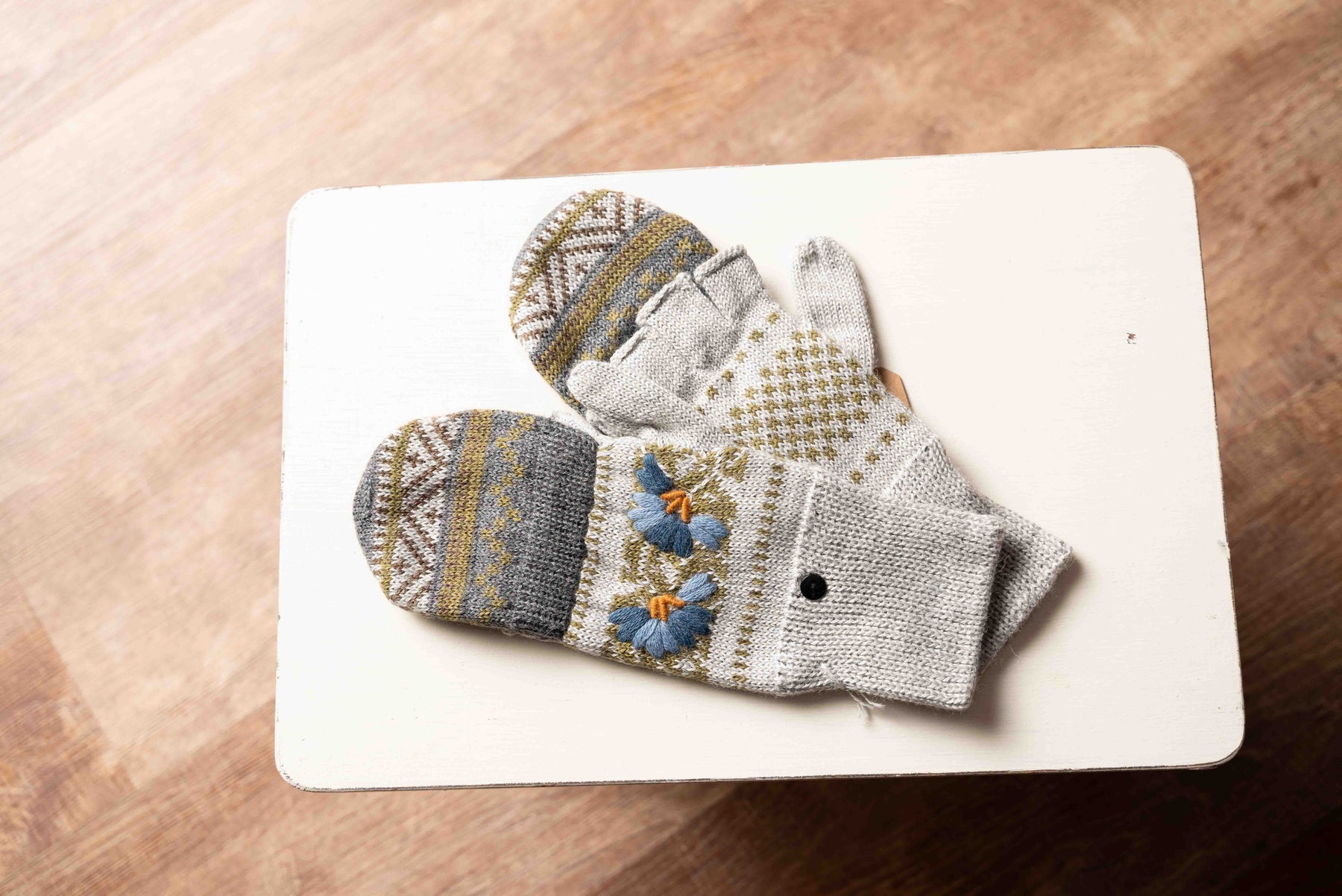 Function meets charm in the Silver Ridge Alpaca Glittens. These flip-top mittens feature a rich geometric knit and hand-embroidered floral accents in golden ochre and sky blue. The soft fleece lining keeps hands toasty, while the fingerless design lets you text, snap photos, or sip cocoa with ease.