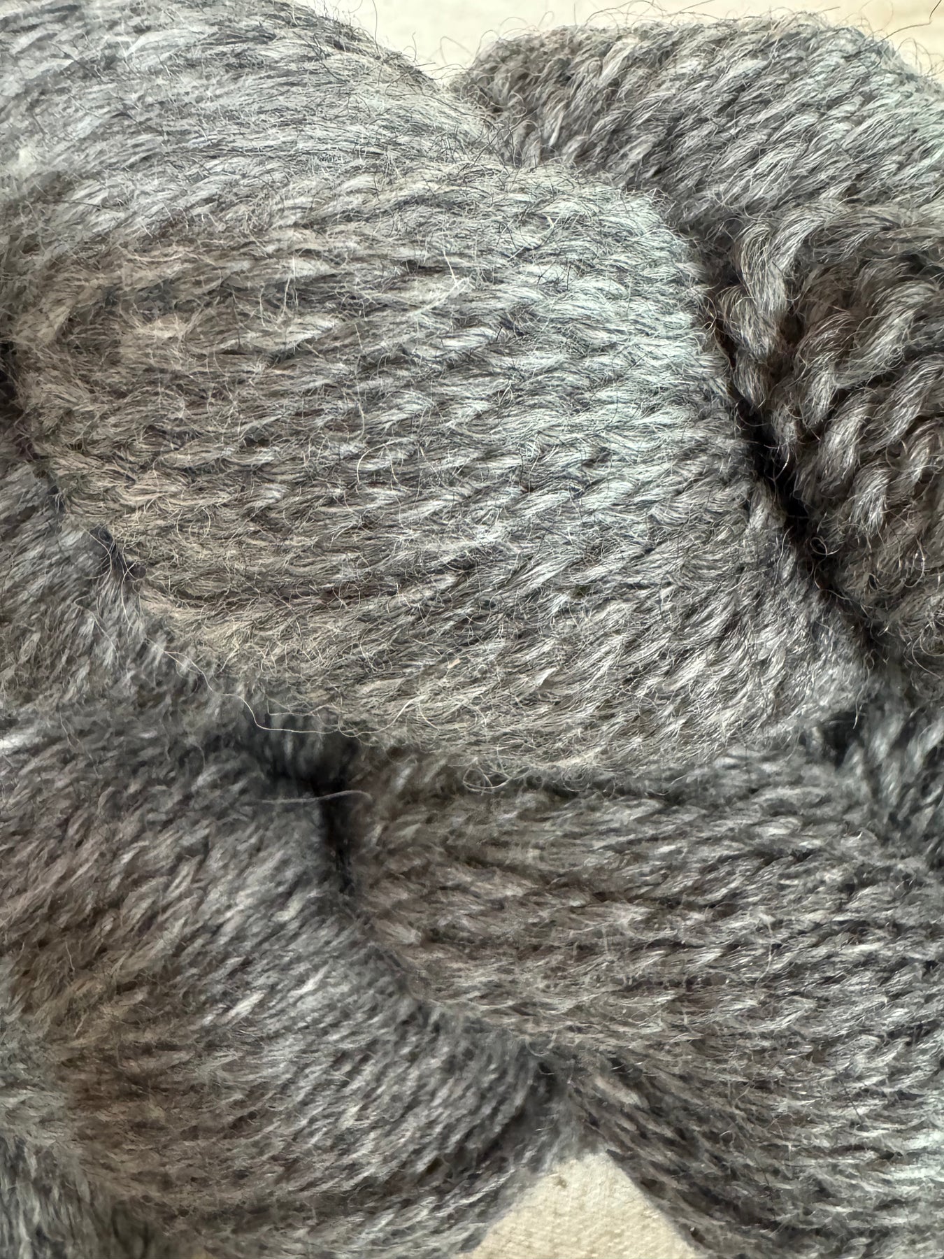 Buttery soft yarn skein from our wonderful girl, Graycie. Yarn is ethically sourced (from yearly shearing). 100% Alpaca yarn. Gray 2-ply worsted wt 162 yards. Yarn is natural and undyed.